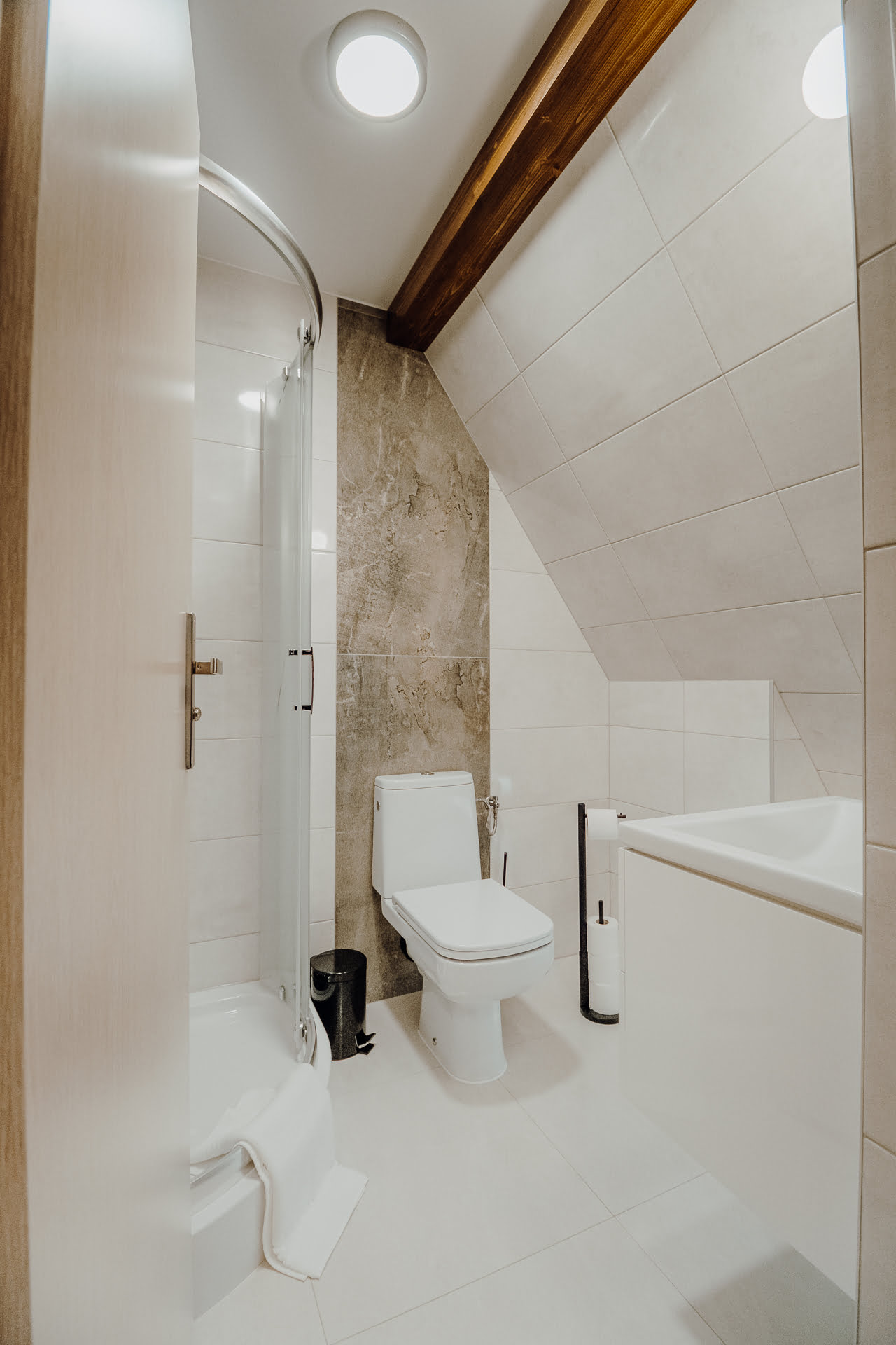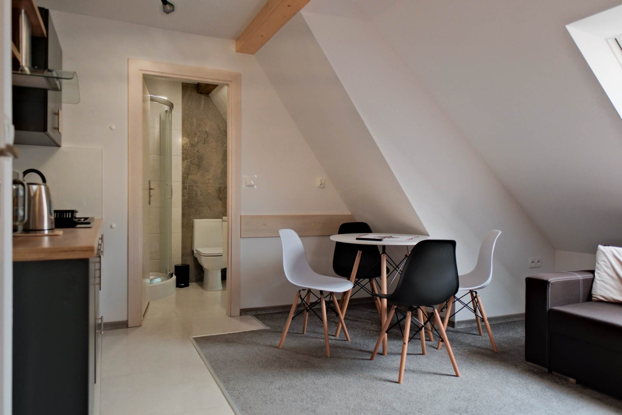 Antresola oferuje wygodne łóżka dla dwóch osób, a na dole znajduje się rozkładana kanapa z funkcją spania dla kolejnych dwóch osób. Apartament posiada również okna dachowe, które zapewniają piękny widok na Giewont, górską ikonę Tatr. Aneks kuchenny jest w pełni wyposażony, umożliwiając przygotowanie posiłków we własnym zakresie. W łazience znajduje się suszarka do włosów, co jest przydatne dla gości. Całość tworzy komfortową i przyjemną przestrzeń, która zapewnia wygodę i relaks podczas pobytu w Zębie.