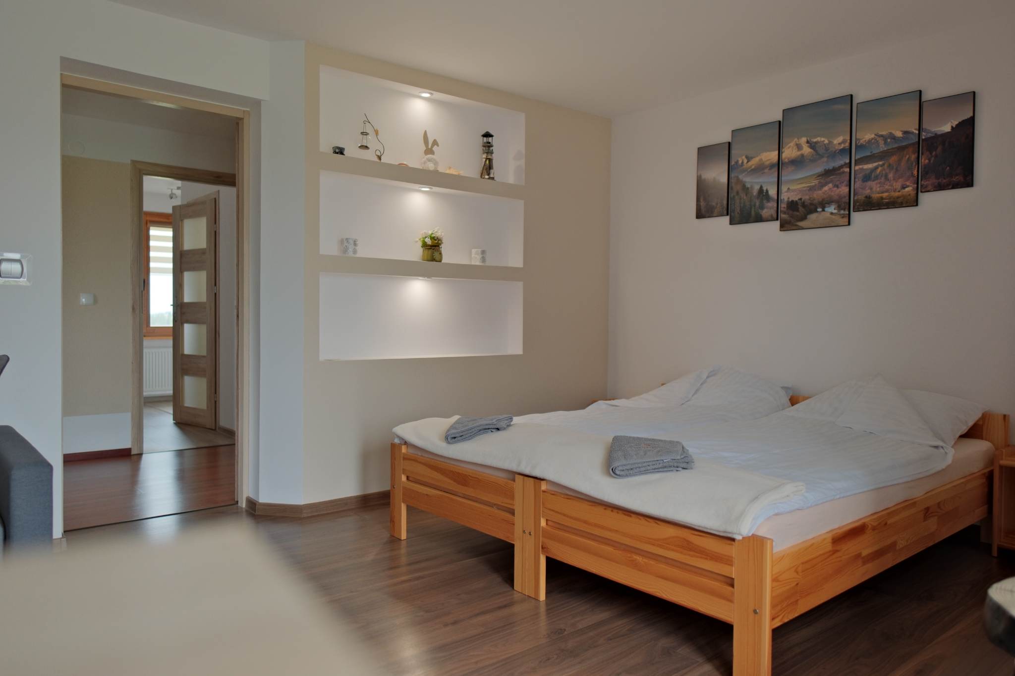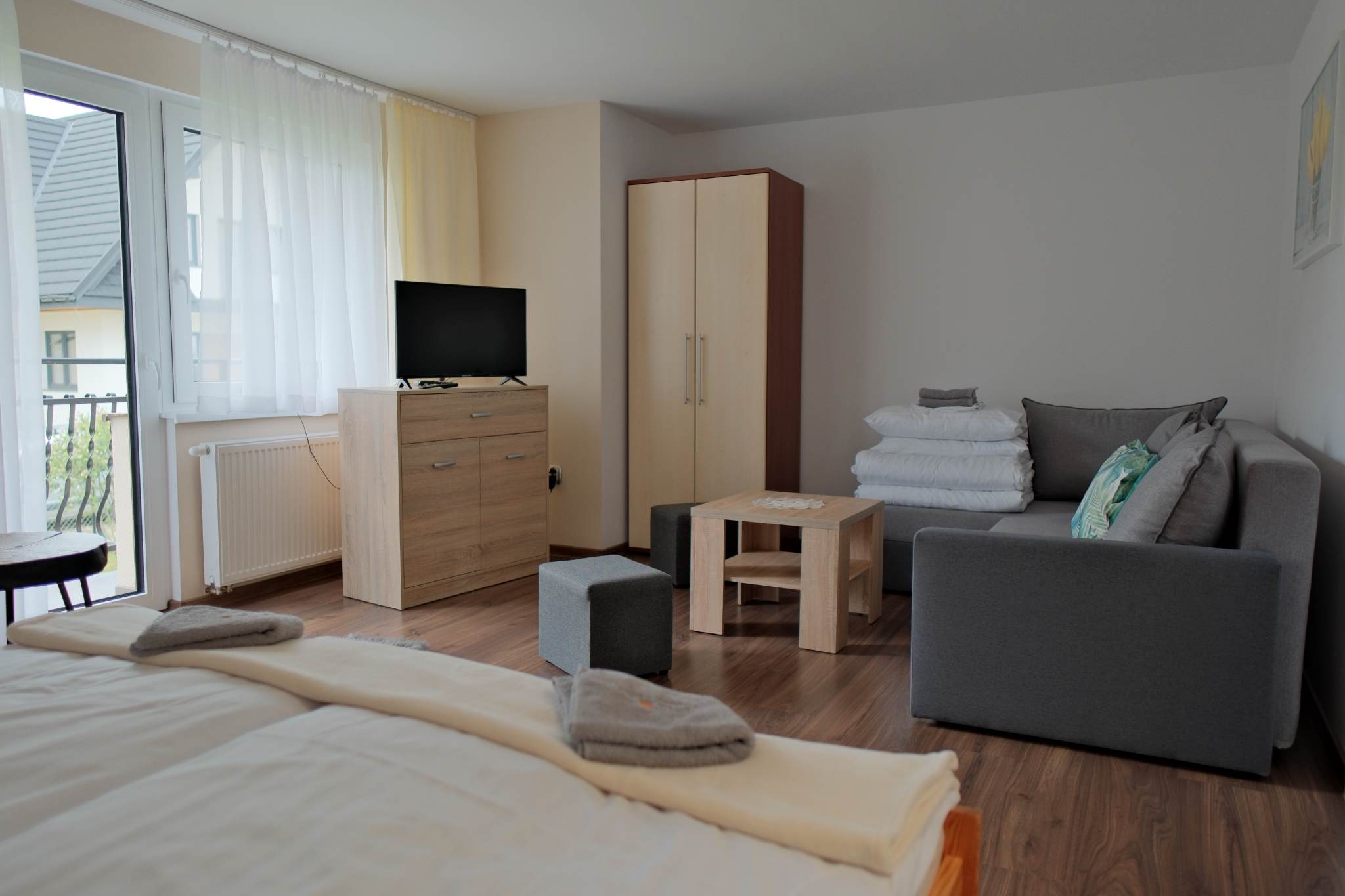 Pokój 4-osobowy, jest wygodnym i przytulnym miejscem do odpoczynku. Wyposażony jest w trzy łóżka, z czego jedno to kanapa z funkcją spania.